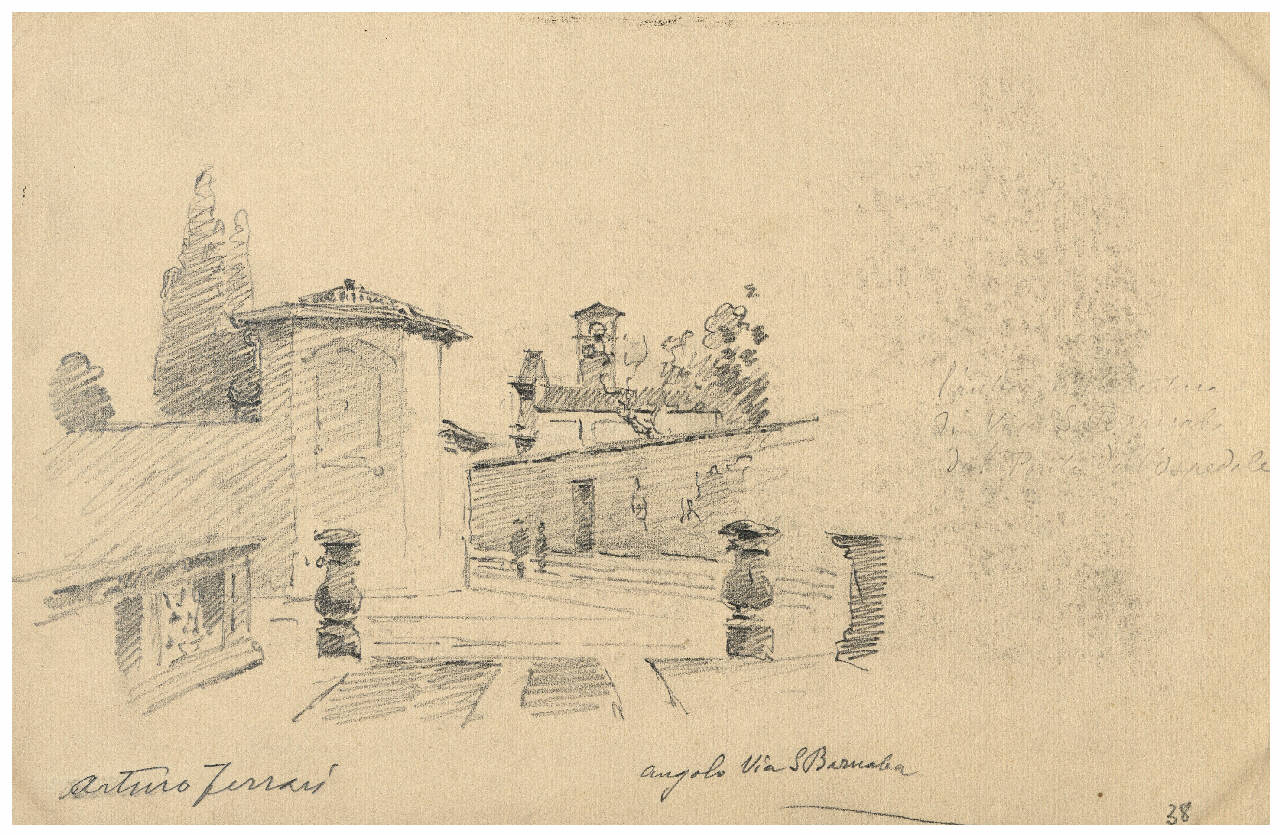 Disegno a matita raffigurante via San Barnaba a Milano\nIl disegno si trova all'interno di un album contenente una raccolta di disegni di Arturo Ferrari.