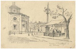Disegno a matita raffigurante Piazza Sant'Eustorgio e Via Santa Croce\nIl disegno si trova all'interno di un album contenente una raccolta di disegni di Arturo Ferrari.
