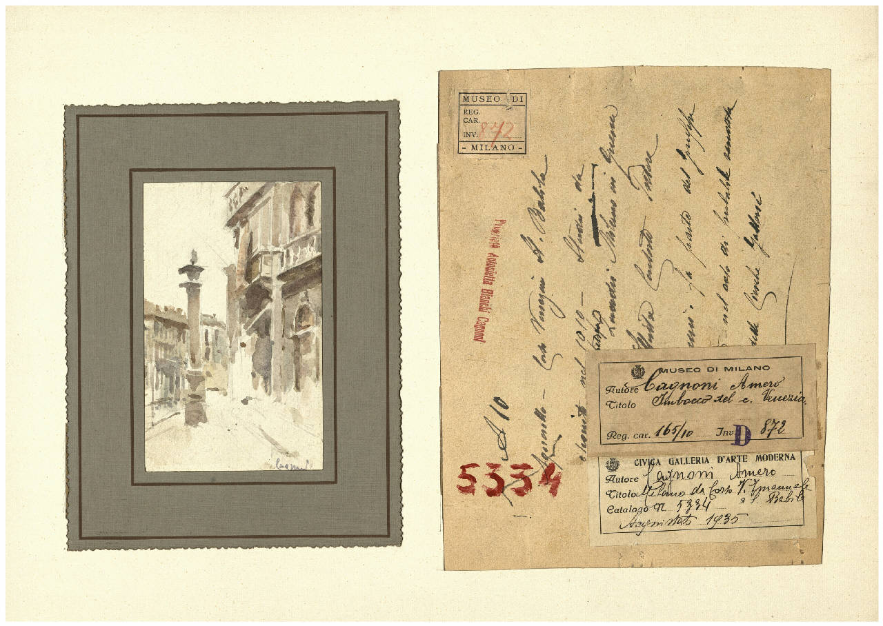 - NOTIZIE STORICO CRITICHE L'acquarello è inserito in una cornice di carta, sullo stesso supporto si trova il precedente cartone che serviva da supporto all'acquarello. \nIl foglio riporta un'iscrizione e le etichette del Museo di Milano.