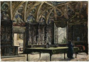 disegno raffigurante l'interno della Sagrestia di Santa Maria della Passione a Milano, in alto spicca la volta affrescata con lunette e medaglioni, al centro della sala un grandetavolo coperto da un drappeggio verde.