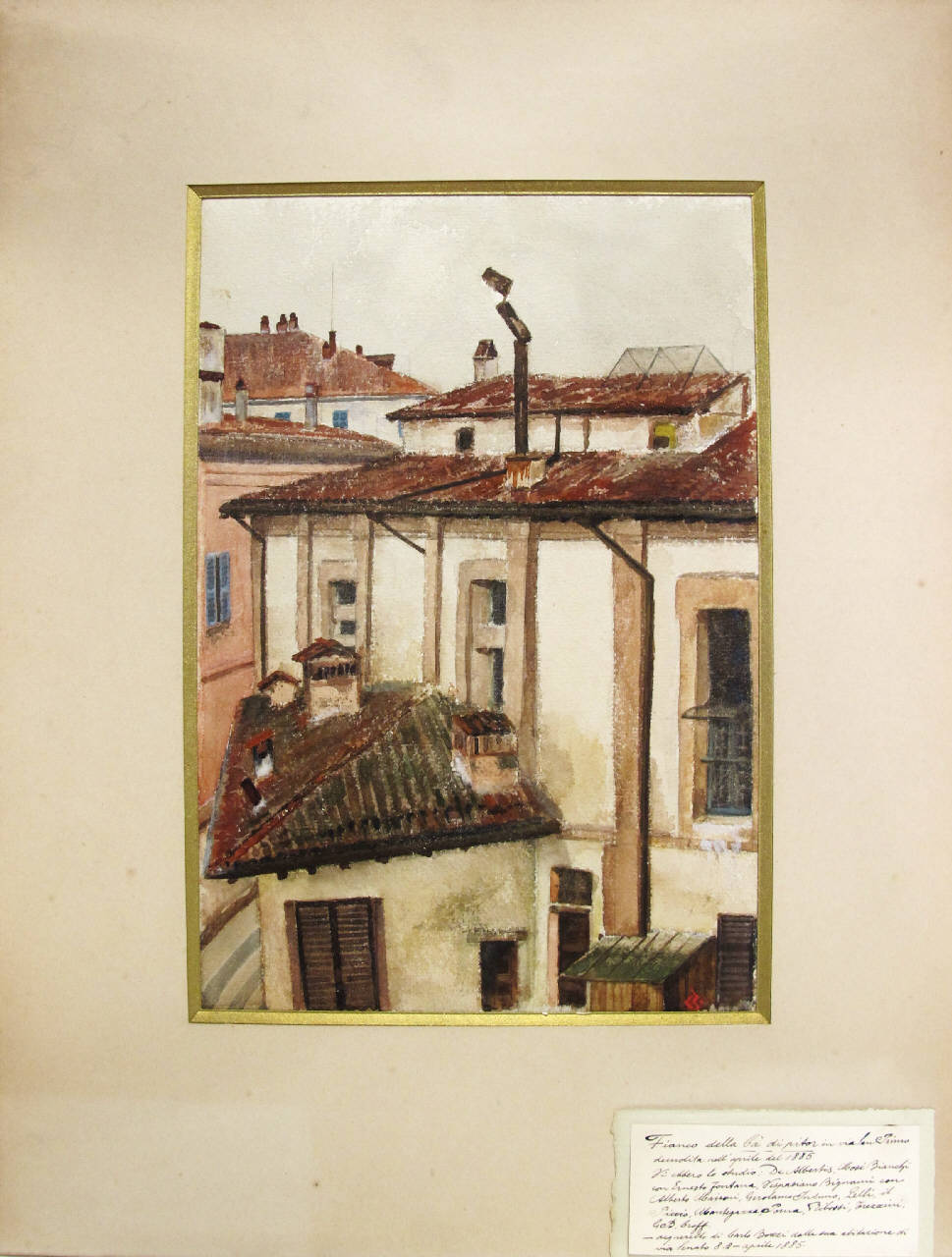 L'acquarello raffigura la veduta dei tetti a fianco della casa dei pittori in via San Primo demotila nel 1885.