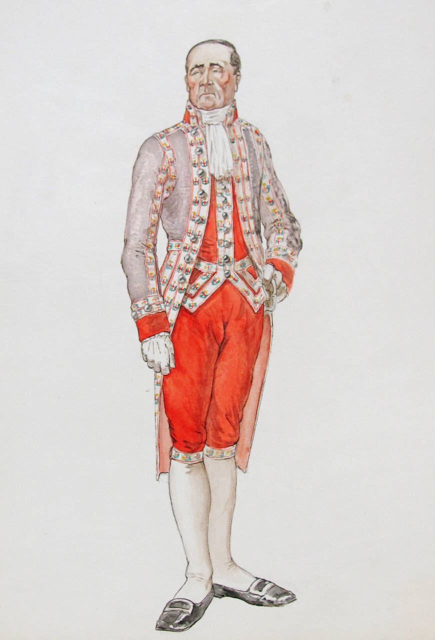 - NOTIZIE STORICO CRITICHE Sul retro del foglio è riportato il numero di Registro di carico del Museo di Milano: 745\nI disegni sono accompagnati da documentazione dattiloscritta del Podestà di Milano, anno 1933 o 1935 (la data 1933 è sostituita con nota manoscritta con il 1935), numero di Protocollo Generale 147/626.\nIl documento informa che il Comune di Milano ha disposto la rappresentazione grafica di 18 figurini con uniformi della tradizione milanese.