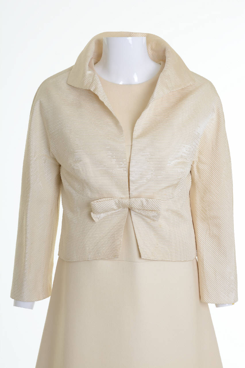 La giacca morbida e corta a un petto ha le maniche a tre quarti. Il dietro è in due tagliati a comprendere la parte posteriore delle maniche a kimono ed è sagomato con due pinces al collo. I davanti sono modellati in due parti unite sotto lungo il taglio arrotondato che partendo dall'ascella si abbassa a creare un effetto di vita alta. Il telo superiore comprende il davanti della manica. Il colletto, leggermente scostato, è un listino ripiegato su se stesso confezionato sul tessuto in sbieco. L'allacciatura è costituita da un unico gancio nascosto, mascherato da un fiocco piatto di ottoman in sbieco. Nell'orlo della giacca sono inseriti diversi piombini rotondi.\nLa giacca, completata con un vestito diritto a girocollo (andato perduto), fu realizzata da Federico Forquet p er le nozze di Rosanna Schiaffino con Alfredo Bini avvenute nell'ottobre 1963. Nella foto è abbinata a un vestito bianco non pertinente anche se di Forquet e appartenuto a Rosanna Schiaffino (cat. 10).
