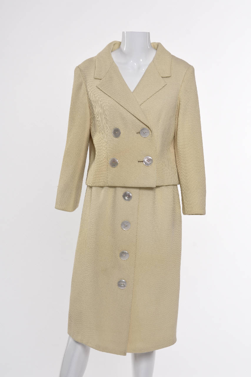Il tailleur è composto da giacca e gonna. La giacca doppio petto con collo a revers scostato è a sacchetto sul dietro e leggermente sagomata con due pinces sul davanti.\nÈ confezionata con tre teli, il posteriore dei quali comprende anche le maniche che risultano a kimono sul dietro e a giro sul davanti. Un triangolo sottoascella ne completa la vestibilità.\nL'allacciatura è costituita da quattro grossi bottoni di madreperla e un automatico ricoperto nascosto.\nLa gonna di linea diritta è sagomata in vita con pinces. Sul davanti presenta una piega che simula una sovrapposizione a portafoglio sottolineata da quattro bottoni di madreperla.\nAllacciatura con cerniera sul fianco sinistro.