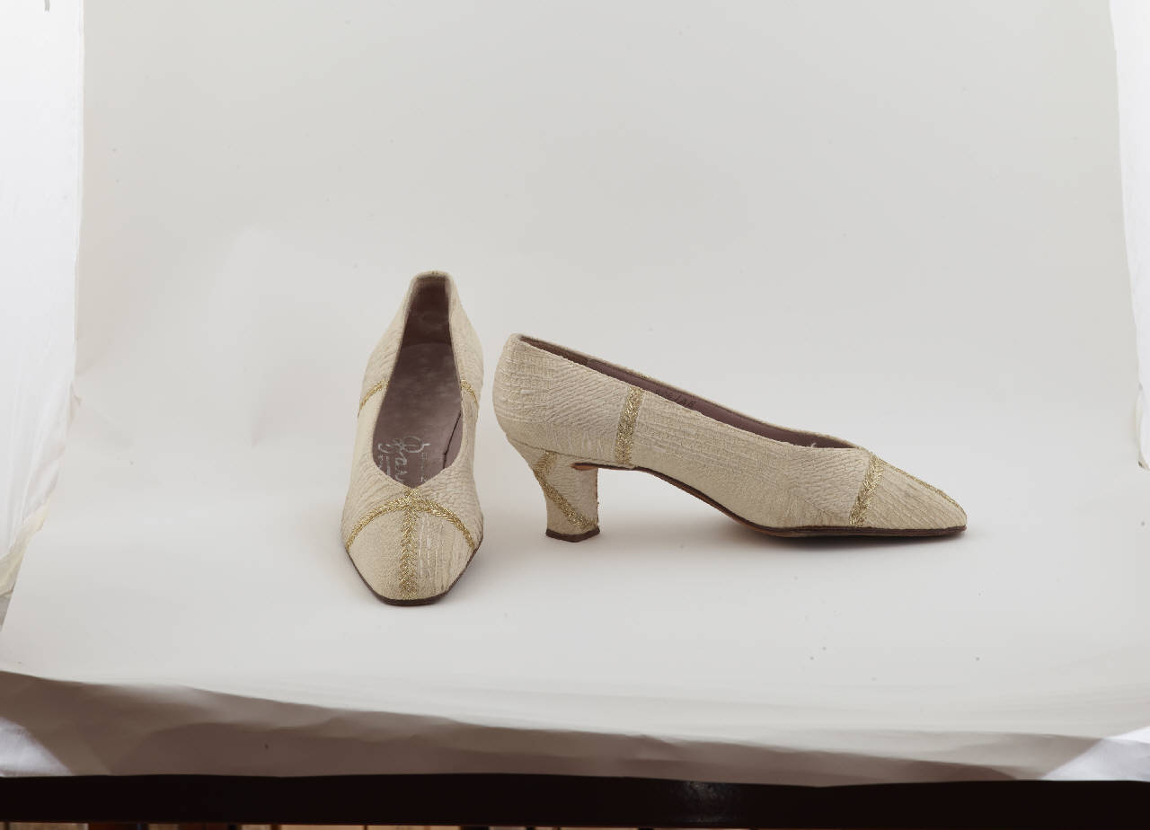 Scarpe décolleté di pelle ricoperta di tessuto con tacco a rocchetto. Suola di cuoio.