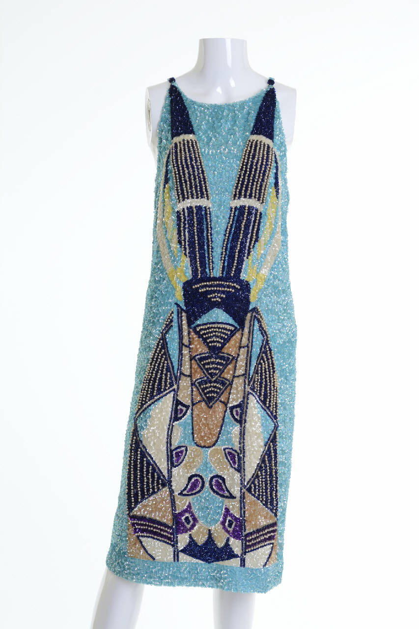 Abito intero di linea diritta, con scollo a barchetta sostenuto da due brevi spallini abbottonati ai lati del collo. Finiture interne con nastro di velluto azzurro. Il modello è interamente ricoperto da una decorazione a ricamo eseguito a mano, ad applicazione di pailletter e di perle artificiali a motivo di maschera tribale.