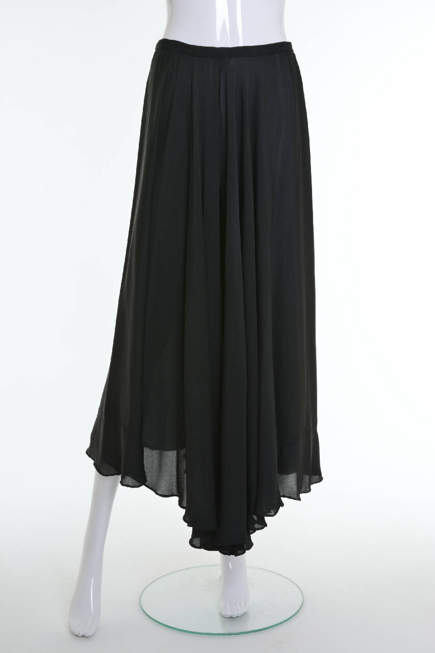 I pantaloni a vita bassa, lunghi e amplissimi hanno le gambe tagliate in sbieco a ruota. Rifiniti in vita con una semplice cintura , sono allacciati con una cerniera.
