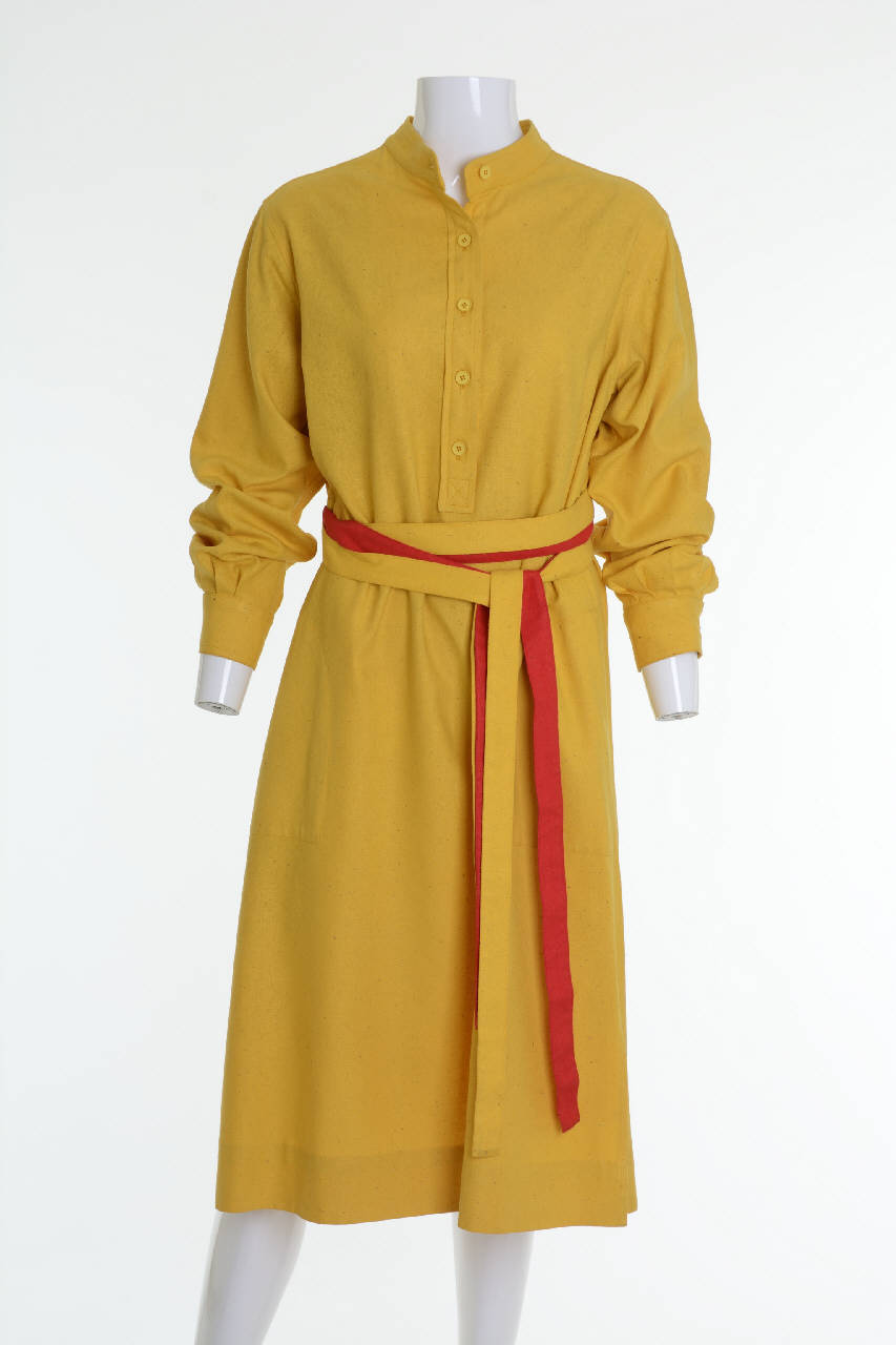 L'abito intero a camicia, diritto e con spacchi laterali, ha l'abbottonatura parziale sul davanti, il collo alla coreana e le maniche lunghe con polsino. Sul dietro delle spalle, taglio a carré. Due ampie tasche inserite ai fianchi. È stretto in vita con due cinture a nastro, una gialla e una rossa ciascuna lunga 256 cm.