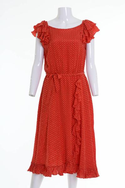 L'abito intero tagliato in vita è senza maniche. Il corpetto di linea morbida presenta ai lati dellas collatura arrotondata due allacciature con tre bottoncini. Nella parte superiore del giromanica sono applicati due volants che ricadono sulle braccia a formare un effetto di brevissima manica.\nLa gonna, in tre teli, a portafoglio stondato con ampia svasatura è bordata con un volant.\nIn vita, una cintura a nastro dello stesso tessuto.\nAllacciatura con cerniera sul fianco sinistro.