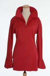 Abito aderente di raso foderato di crêpe, tagliato in vita solo sul dietro.\nIl davanti intero in due teli presenta uno scollo a fenditura. Il colletto arrotondato è doppiato in modo da rimanere rialzato. Le spalle sono imbottite e le maniche a kimono sono allargate a imbuto con spacco al polso. La parte posteriore è tagliata in vita: la gonna è stretta, mentre la parte superiore è confezionata ocme fosse il dietro di una giacca aderente con le lunghe falde scostate e aperte con uno spacco al centro. Allacciatura con cerniera al centro dietro e sul fianco sinistro.