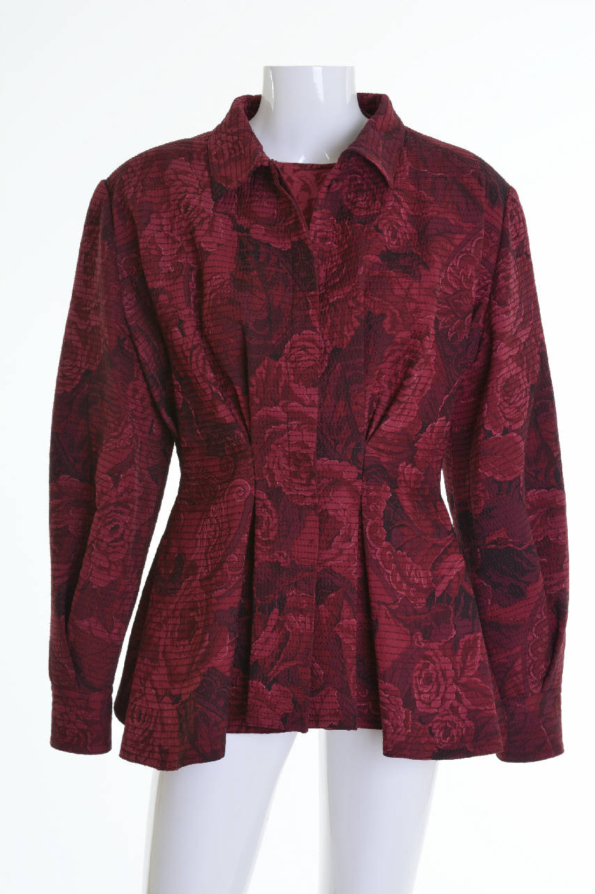 La giacca dal taglio a camicia è confezionata con taffetas crêpe a rose doppiato con crêpe, uniti da fitte impunture parallele. Il modello presenta un colletto a camicia rivoltato e leggermente sovrapposto nella parte anteriore, maniche lunghe a giro con polsino abbottonato. Il dietro, in due teli, è diritto, mentre i davanti, tagliati all'orlo in modo asimmetrico, sono ripresi con doppie pieghe e cannoni cuciti solo nel punto vita. Allacciatura centrale nascosta con 4 bottoni ricoperti e un bottone a pressione al colletto. La giacca era completata da un'alta cintura ora mancante.\nLa blusa di raso di linea sciancrata, ha il collo a giro, le spalle con imbottitura e le maniche lunghe diritte. Allacciatura con cerniera al centro dietro e sul fianco sinistro.