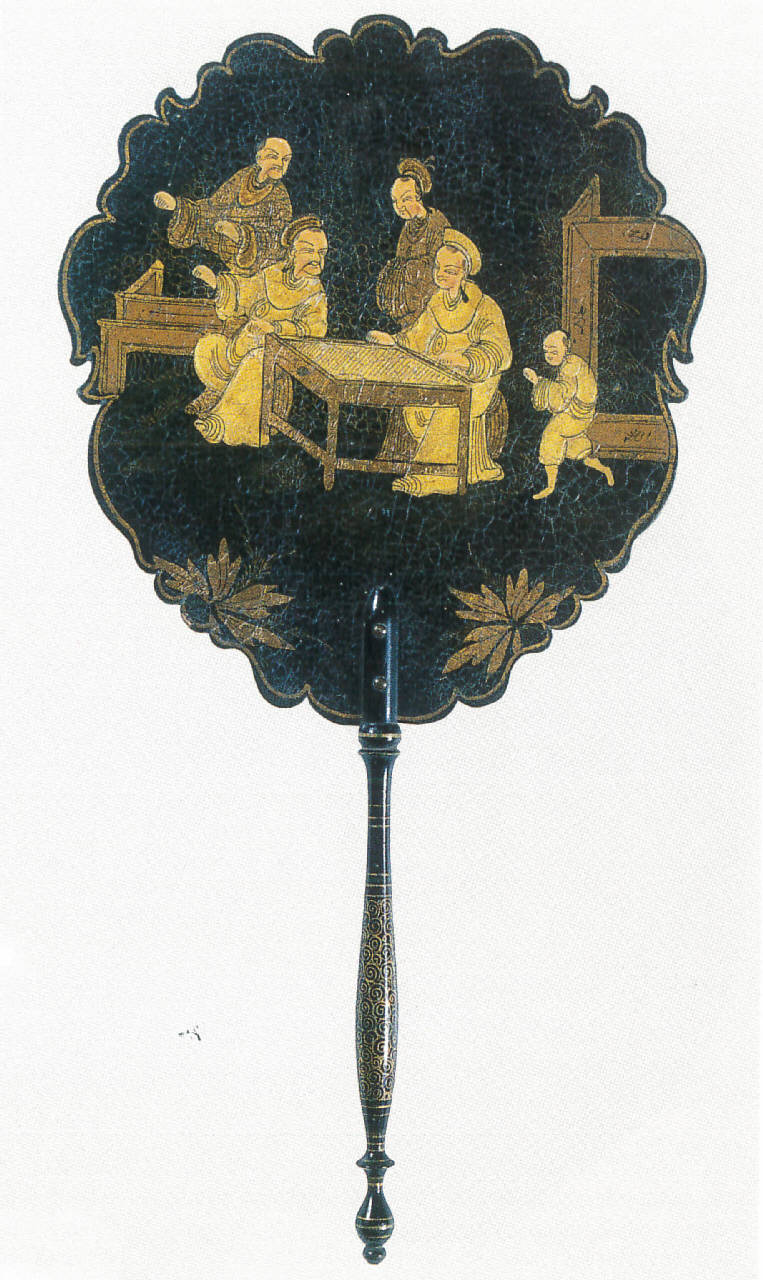 Ventola da fuoco a schermo. Schermo circolare sagomato in legno laccato nero, dipinto in oro di tre tonalità con parti rilevate in stucco; il profilo è intagliato a "rocaille". Il manico è a fuso modanato in legno laccato nero, decorato da piccole spirali dipinte in oro, fissato allo schermo da due perni in ottone.