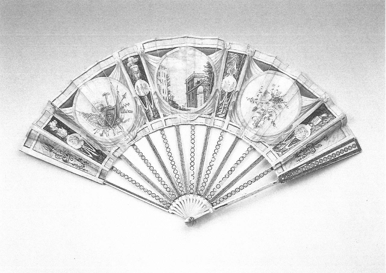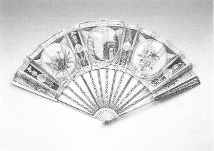 - NOTIZIE STORICO CRITICHE L'esemplare riprende nella sua struttura la tipologia dei ventagli settecenteschi da "grand Tour", ma gli edifici raffigurati nel medaglione centrale non ricordano località o palazzi noti. Potrebbero forse rappresentare una residenza in riva ad un lago italiano, forse addirittura lombardo: se così fosse il ventaglio potrebbe intendersi come souvenir di un soggiorno in terra italiana.\nProbabilmente fu realizzato su commissione.