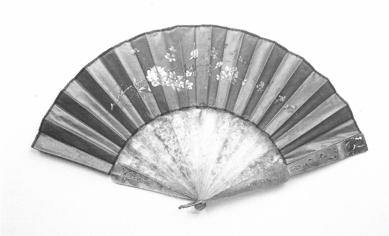 Ventaglio pieghevole. Quattordici stecche di tartaruga bionda traforate; guardie a spatola decorate come le stecche minori da motivi a traforo di racemi alternati a fiori e cornucopie. Rivetto in metallo, occhiello in acciaio, anello reggiventaglio con anellino per "chateleine" in ottone.\nPagina doppia in raso di seta marrone dipinta ad olio, decorata da un tralcio di rose gialle, fiori di melo, di pesco e nontiscordardime disposto ad arco sulle stecche minori. Bordino di finizione all'estremità della pagina in pizzo nero meccanico.