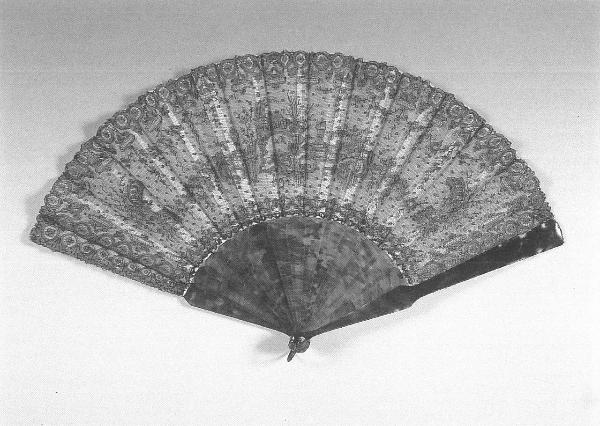 Ventaglio pieghevole. Sedici stecche in tartaruga scura, guardie a spatola curva e intagliata, le minori stondate. Rivetto in tartaruga, anello reggiventaglio in ottone laccato nero intagliato.\nPagina in trina a fuselli Chantilly di seta nera, fissata su organza di seta avorio con bordini in pizzo meccanico nero. Il disegno raffigura un giardino percorso da ponticelli, archi e vasi fioriti, con echi giapponesizzanti, nonostante gli elementi di arredo siano propri del giardino all'italiana, disposto lungo una grande curva che segue quella della pagina e che si raccoglie ai lati in due elementi a balaustra. Il disegno e l'esecuzione lasciano supporre che la pagina sia stata realizzata su precisa commissione appositamente per questo ventaglio.