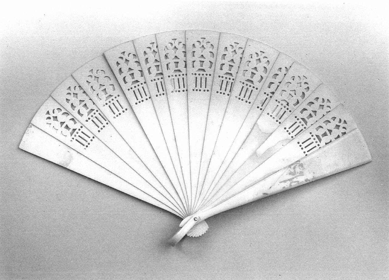 Ventaglio brisé da borsetta. Quindici stecche in bachelite imitante l'avorio traforate a giorno con un motivo stilizzato d'ispirazione orientale, ad eccezione delle guardie che sono lisce bombate e terminano a spatola. Rivetto in metallo, anello reggiventaglio in bachelite. Nastro per tenere unite le stecche in raso di seta bianco a righe rosa, di cui rimane solo un frammento.