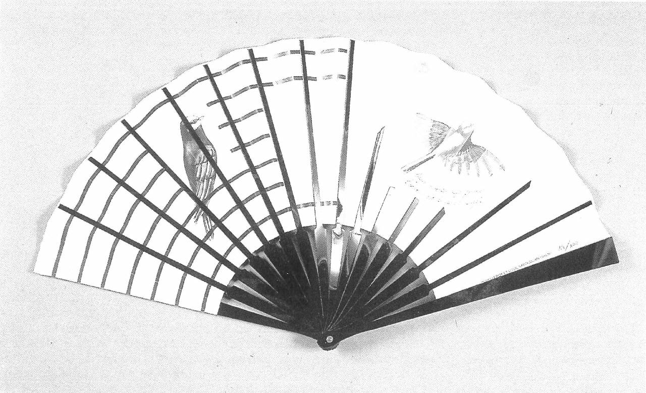Ventaglio pieghevole. Sedici stecche in plastica nera; guardie a spatola tronca. Rivetto in metallo, occhiello in plastica trasparente. Pagina in carta lucida stampata offset a colori bianco e nero al verso: la raffigurazione presenta un cielo suddiviso in tre spazi verticali all'interno dei quali vi sono delgi uccelli simili a fenicotteri. Ciascuno di essi ha un nome: da sinistra, "oiseau Lion", "oiseau Dragon", "oiseau Demon". In basso figura la scritta: "Et des zoiseaux zoiseaux roses [sic]".\nAl verso è raffigurato un uccellino in gabbia, le cui fasce sono strisce nere stampate, mentre quelle verticali sono le stecche stesse, troncate sulla destra a diversa altezza, così da lasciar volare fuori l'uccellino. Sotto si trova la scritta. "Cage ouverte, cage fermée / l'oiseau est-il dans la cage?".
