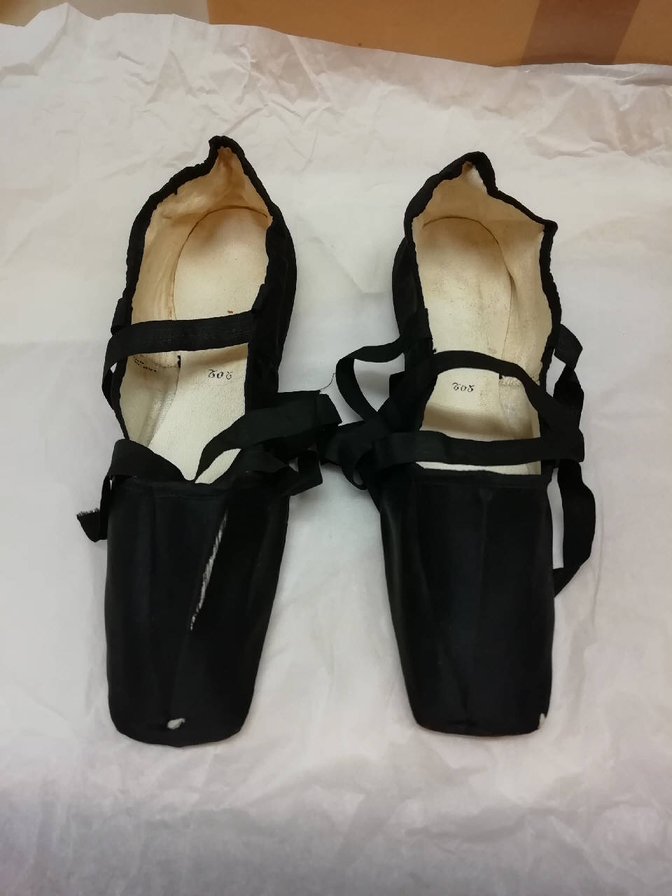 Scarpa femminile modello ballerina in raso di seta nero. Entrambe le scarpe hanno ai lati dei lacci in raso di seta nero. Scollo e punta squadrati. Bordatura dello scollo non operata in raso di seta nero, dove all'interno si trova un cordino che permette la chiusura delle scarpe. Interno in pelle e tela color avorio; sulla soletta di entrambe le calzature è presente il numero 202 nero. Suole in cuoio marrone. La suola della scarpa a presenta il numero 9 in nero, mentre quella della scarpa b il numero 10.
