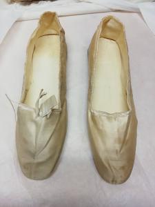Scarpa femminile modello ballerina in raso di seta bianco avorio. Punta tonda affusolata, scollo quadrato. Bordatura dello scollo non operata in raso di seta bianco avorio dentro alla quale è presente un cordino che permettere di stringere le scarpe. Sulla scarpa b è presente un fiocco in raso di seta bianco avorio sulla parte centrale dello scollo. Suole in cuoio marrone. Insieme alle scarpe vi è una fotografia in bianco e nero che riporta due immagini delle calzature in questione; sul retro vi è stampato il numero 28670 e vi è la scritta "s.n.".