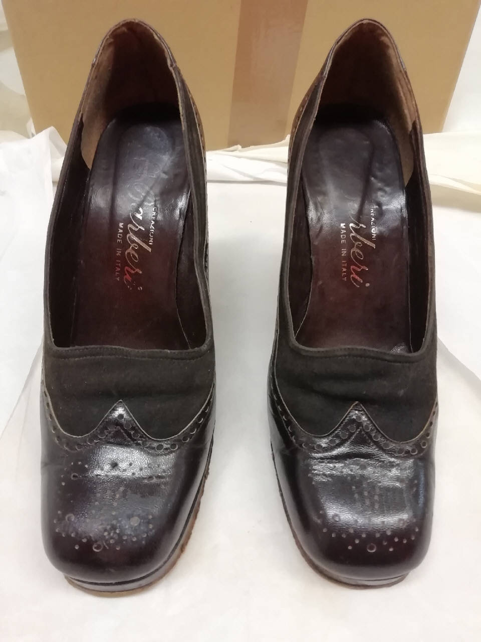 Decolletè in pelle testa di moro con zeppa in pelle testa di moro alta 7 cm. Decorazione a traforo sulla punta della scarpa. La parte attorno allo scollo è in pelle scamosciata marrone. Scollo e punta stondati. Interno in pelle marrone; sulla soletta presente il marchio Creazioni Barberi Made in Italy. Suola in cuoio con inciso il numero 37; tacco rivestito in gomma.