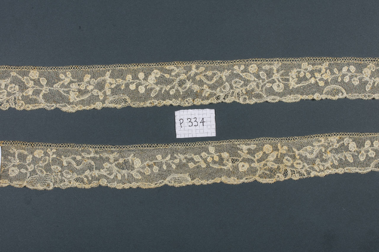 Bordo a fuselli a parti riportate tipo Bruxelles su rete "drochel". All'interno degli elementi decorativi "remplis" diversi. cm 5,5 x 150.