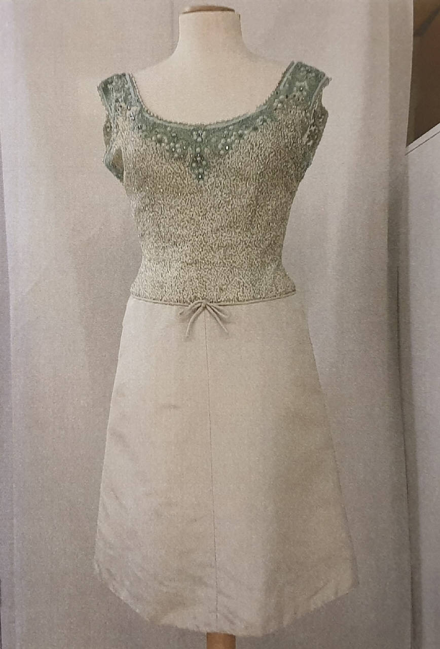 Abito da cocktail linea trapezio in gros di seta verde acqua chiaro con corpino in tulle ricamato con paillettes, conterie di vetro e perline in plastica e strass; fodera in taffetas in colore sostenuta da tessuto di rinforzo. piombini inseriti nell'orlo mantengono la linea dell'abito. all'interno delle spalline un nastrino chiuso da bottoni automatici serviva a trattenere le spalline della fodera dell'abito.
