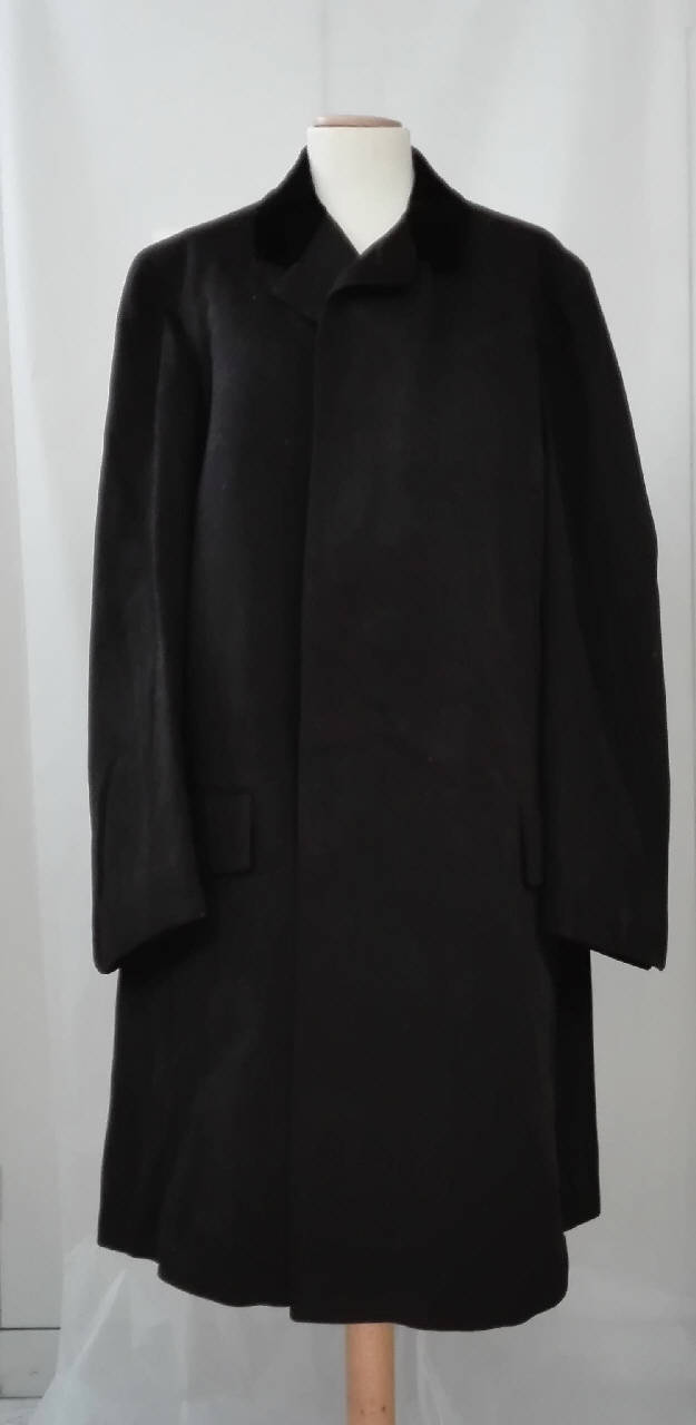 Soprabito maschile in panno di lana nero chiuso da quattro bottoni rivestiti in tessuto con colletto in velluto di seta nero taglio dritto, maniche svasate con piccolo spacco dal bordo arrotondato, due tasche nella parte anteriore. \nfodera in lana con spigato a righe nere grigie e marroni. \nfodera maniche in raso rigato.