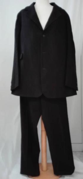 Completo maschile composto da giacca monopetto chiusa da quattro bottoni rivestiti in tessuto e pantaloni in panno di lana nero con fodera in raso di seta nero.\nquattro tasche e due bottoni ai polsi delle maniche.\nfodera interna della giacca con etichetta "Fratelli Ferrucci Cagliari"\npantaloni in panno di lana nero, chiusura patta con bottoni e gancetto metallico; in vita bottoni in pasta metallici con impresso il marchio.