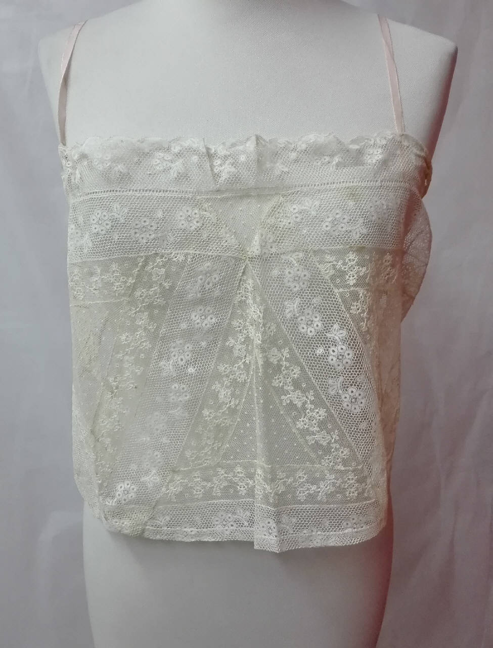 Copribusto in tulle con merletto a fuselli meccanico color avorio sul fronte, spalline in nastro di seta rosa; chiusura posteriore a cinque bottoni.