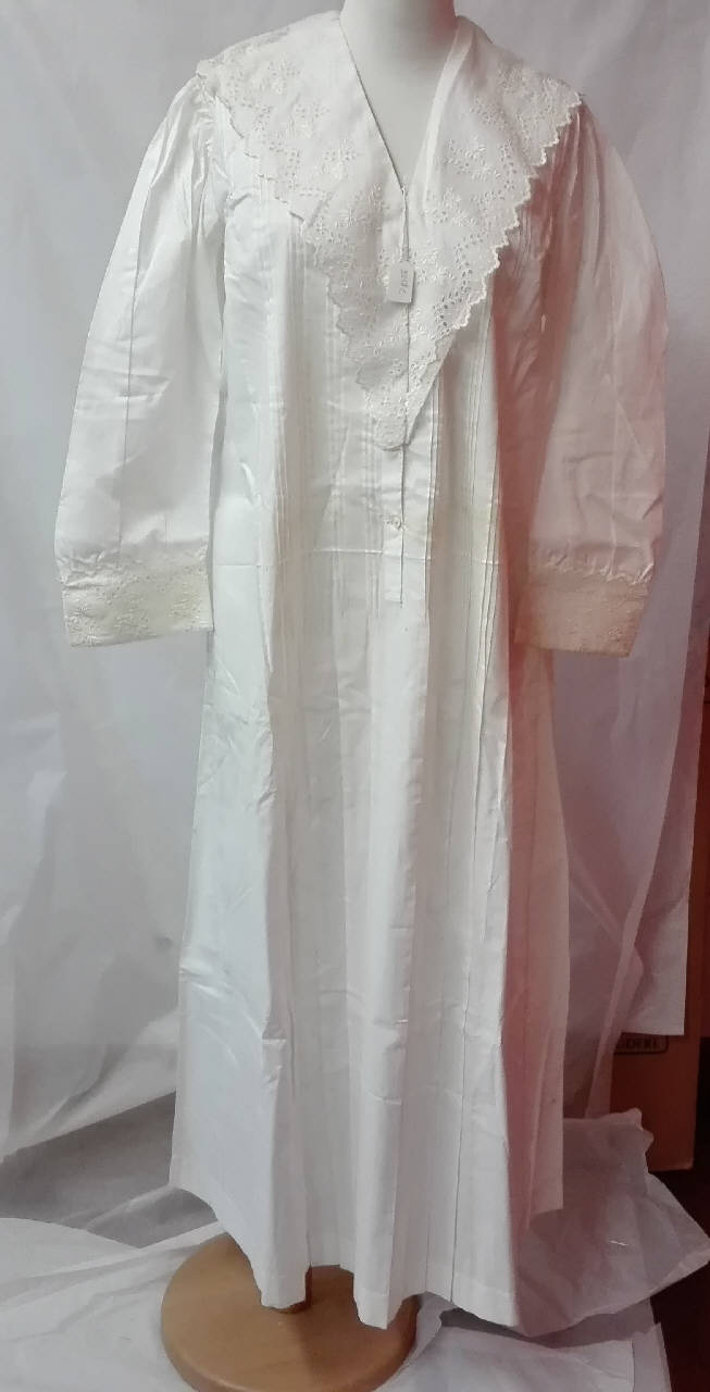 Camicia da notte in tela di cotone bianca con plissettatura nella parte anteriore; chiusura anteriore a tre bottoni nascosti, scollo a scialle decorato con broderie anglaise come alle maniche.\nricamo sul fronte a destra "MR".