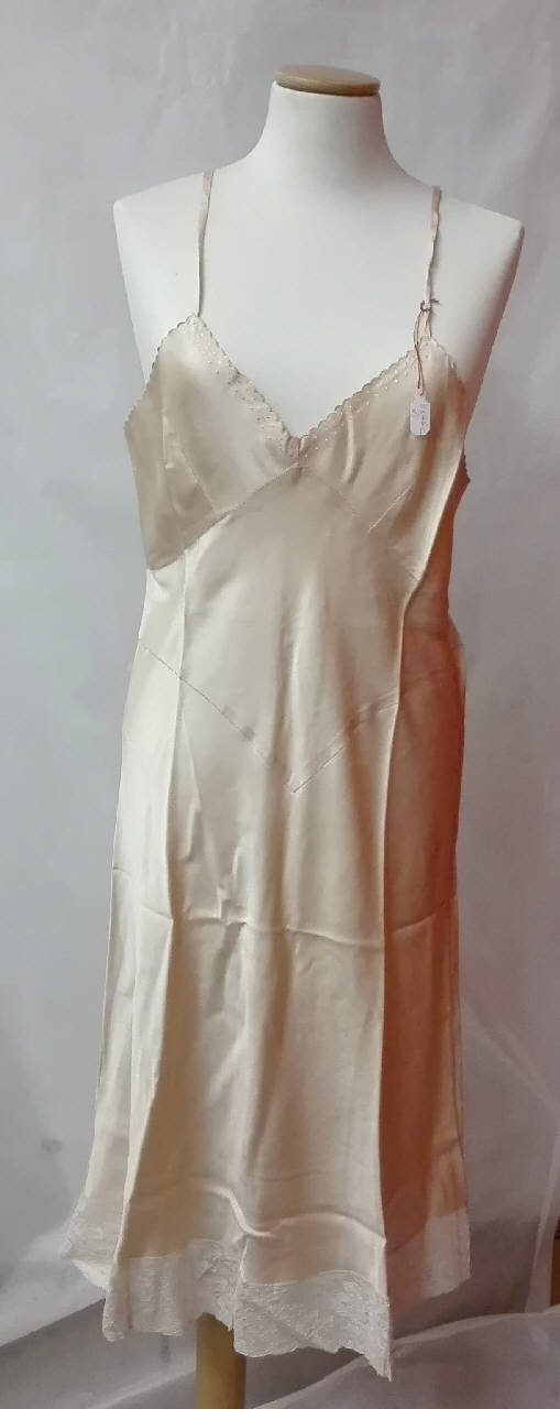 C_3376a: Sottoveste di raso di seta sbieco color pesca senza maniche con spalline; motivo smerlato con piccoli pois allo scollo anteriore in colore; sul fondo, applicazione di pizzo a fuselli meccanico; \nC_3376b: Sottoveste con spalline in raso di seta sbieco color rosa chiaro; smerlatura allo scollo e applicazione di merletto meccanico allo scollo, dove si trova anche un ricamo, e all'orlo.