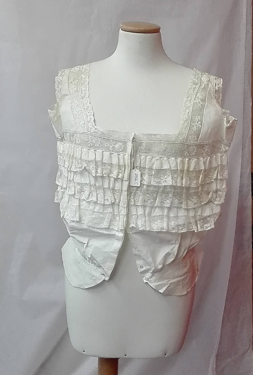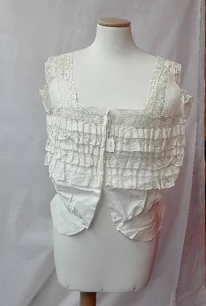 Copribusto senza maniche, scollatura quadrata; nella parte anteriore decorazione a piccoli volant in cotone e in pizzo di cotone a fuselli meccanico. \nchiusura anteriore a nove bottoncini in madreperla. Nel bordo inferiore piccolo monogramma ricamato "RM" (?)