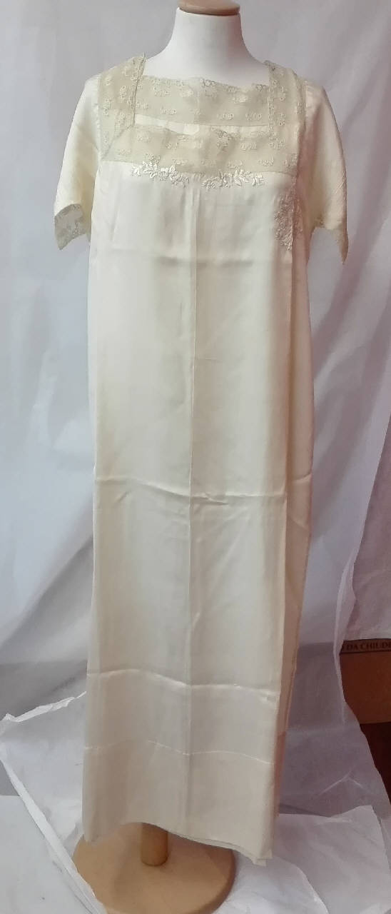 Camicia da notte in raso di seta color champagne a maniche corte con scollo quadrato; maniche e scollo profilato da tulle ricamato. ricamo al centro del petto a punto pieno con motivi floreali.