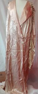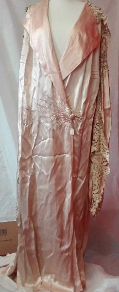Vestaglia in raso di seta color cipria con strascico, maniche ad ali di farfalla e collo sciallato.\nallacciatura anteriore, tramite laccetto interno e bottone esterno foderato in raso in colore, decorata con motivo di piegoline disposte a raggiera. maniche arricciate nella parte interna e arricchite da una alta balza di merletto a fuselli al polso e alle spalle; \nlo stesso merletto crea un motivo a V sul dorso, sostenuto da un pesetto centrale, che incornicia un motivo di piegoline cucite e un ampio spacco sulla schiena.