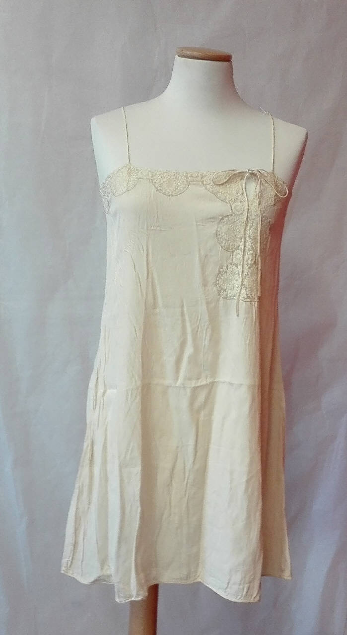 Sottoveste al ginocchio in crespo di seta color avorio con decorazioni asimmetriche in pizzo sul bordo superiore.