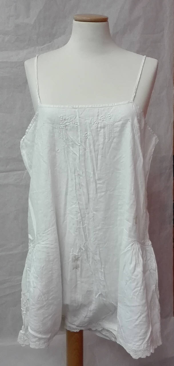 Combinazione in tela di cotone bianco sostenuta da spalline; ricamo a punto pieno e sfilature a giorno sullo scollo; \narricciature ai fianchi, chiusura inferiore con quattro bottoncini in madreperla di cui uno mancante; \nsulle gambe, profilatura di merletto a fuselli.\nRicamo monogramma "GF" al giromanica destro.