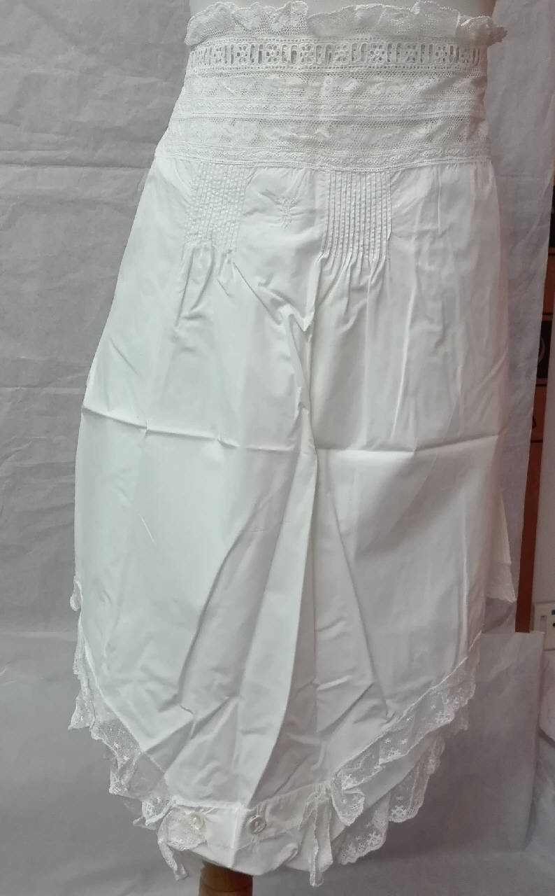 Mutande in tela di cotone bianca, allacciate in vita con passanastro (mancante del nastro); ampia falsatura in vita di merletto a fuselli di tipo meccanico e motivo decorativo a pieghe cucite, ruches di merletto a fuselli meccanico al fondo e chiusura con tre bottoncini di madreperla. \nMonogramma in vita "WS"