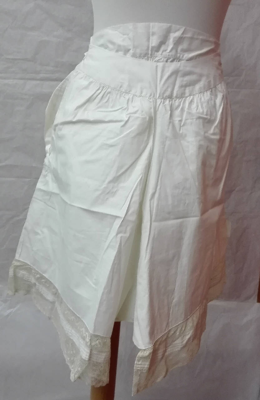 Mutande di tela di cotone bianco con chiusura in vita tramite bottoni e laccetti ai fianchi, decorazione sul fondo con balza in pizzo a fuselli meccanico e motivo di piegoline cucite.\nuguali a C_1611