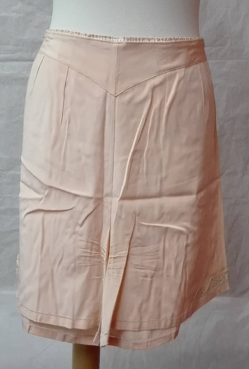 Mutande corte in raso di seta color salmone arricciate tramite elastico sul dorso e chiuse nella parte anteriore con due bottoncini in madreperla. \nsfilatura a giorno sull'orlo inferiore con intarsi triangolari di pizzo meccanico color ecrù.