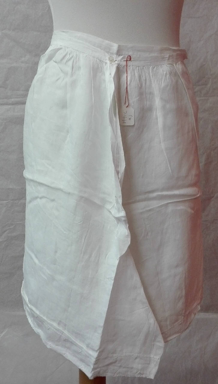 Mutande in tela di cotone bianco chiuse in vita con elastici (a, b, e, f) o bottoncini (c, d), con decorazioni sul fondo: \na) ricami a giorno e ricami a punto pieno a motivo geometrico\nb) motivo a intarsio con fiori stilizzati gialli, sbieco di cotone giallo a profilare l'orlo inferiore\nc) piccolo motivo ricamato a jour e a punto pieno e minuscola smerlatura in pizzo valenciennes\nd) ricamo a giorno che crea decorazione geometrica, al fondo minuti pippiolini creati ad ago\ne) decoro sfilato solo nella parte laterale, volute ricamate a punto cordoncino\nf) decoro solo sui fianchi laterali, sfilato e ricamo a punto cordoncino con medaglioni e mezzi medaglioni riempiti da motivi geometrici\ng) orlo intarsiato in tessuto azzurro chiaro con motivo smerlato di foglie e grappoli d'uva; bordino in tulle bianco profila l'orlo. in vita, monogramma "IMRS". punto vita reciso e mancante dell'elastico.