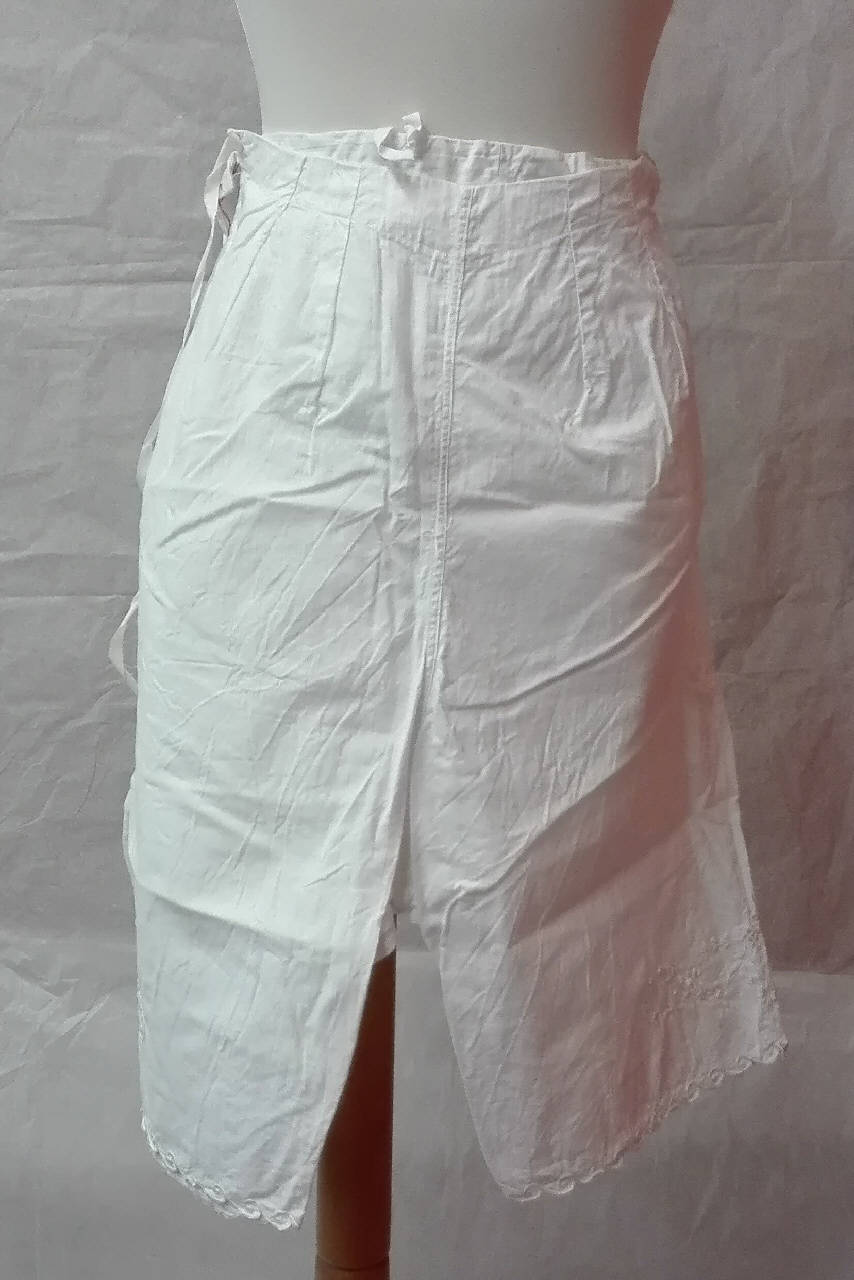 Sette mutande di tela di cotone bianco con chiusura in vita tramite lacci e bottoni, lunghezza al ginocchio con ricami al fondo.\na) ricamo in bianco a punto pieno, punto vapore e a giorno con motivo floreale; orlo rifinito con smerlo a onda. cm 70.\nb) ricamo in bianco ad intaglio e a punto pieno, a motivi floreali, con smerlatura a punto festone. cm 70.\nc) gamba a lieve palloncino con balza finale decorata con ricami a giorno e piccoli motivi floreali a punto pieno; orlo con smerlatura a punto festone;monogramma frontale con lettere "MTF". cm 60.\nd) intarsi in pizzo sangallo meccanico con balza arricchiata alternati a decorazione di pieghine cucite in orizzontale, monogramma interno su fettuccia "F.M." cm 76.\ne) apertura al cavallo, sul fondo decorazione con pieghine e broderie anglaise (meccanico), monogramma a punto croce rosa "TG". cm 80\nf) balza finale con spacchetto laterale decorata con intarsi e bordo perimetrale a fuselli; ai lati dello spacco inserti triangolari in pizzo ad ago e piccoli ricami a punto pieno. cm 70.\ng)gamba leggermente a palloncino, balza finale ricamata a punto a giorno e punto pieno, con intarsi triangolari a merletto ad ago; sull'orlo, decorazione a pippiolini e punto festone; ricamo sul fronte "MTF". cm 60.