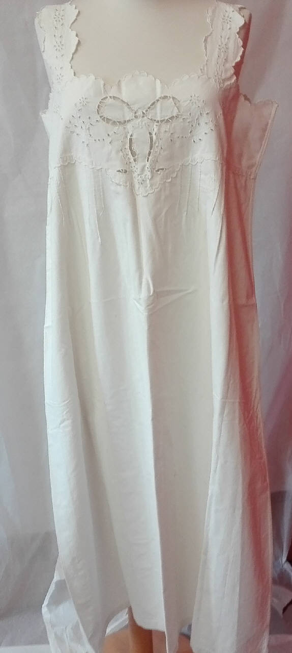 Camicia da notte in cotone bianco ricamato sul carrè e sulle spalline a punto intaglio. \nProfili delle spalline e della scollatura smerlati e ricamati a punto festone. \nPresenza di un monogramma recante la lettera "M" sulla sinistra del corpino.