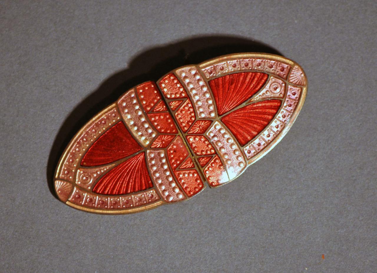 Fibbia a fermaglio da cintura, di forma composta. Corpo in metallo argentato, in due pezzi. Ciascuno sagomato con profilo centinato, fascia esterna metallica, decorato a riserve geometriche lavorata a smalto a «basse taille» nei toni del rosso e del rosa su fondo operato a motivi ricordanti palmette stilizzate e fasce a greche perlinate. Passanti e ganci in metallo argentato.