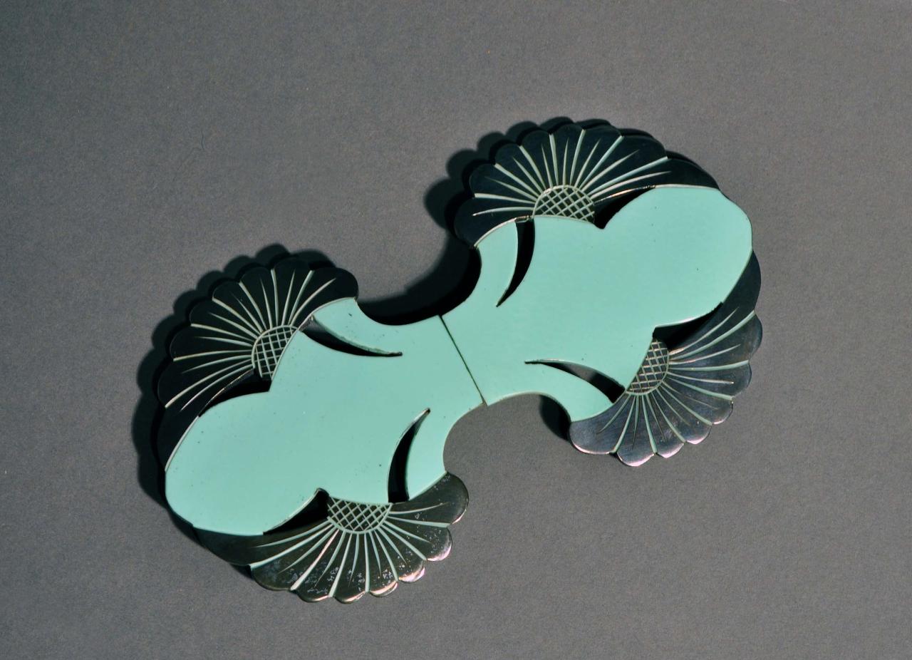 Fibbia a fermaglio da cintura di forma composta. Corpo in galalite nera sagomata, incisa e dipinta, in due pezzi. Ciascuno decorato a traforo con motivo composto da due corolle di margherite contrapposte e foglie stilizzate dipinte in verde acqua. Passanti e ganci in metallo cromato.