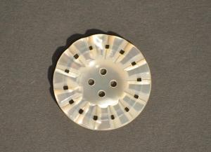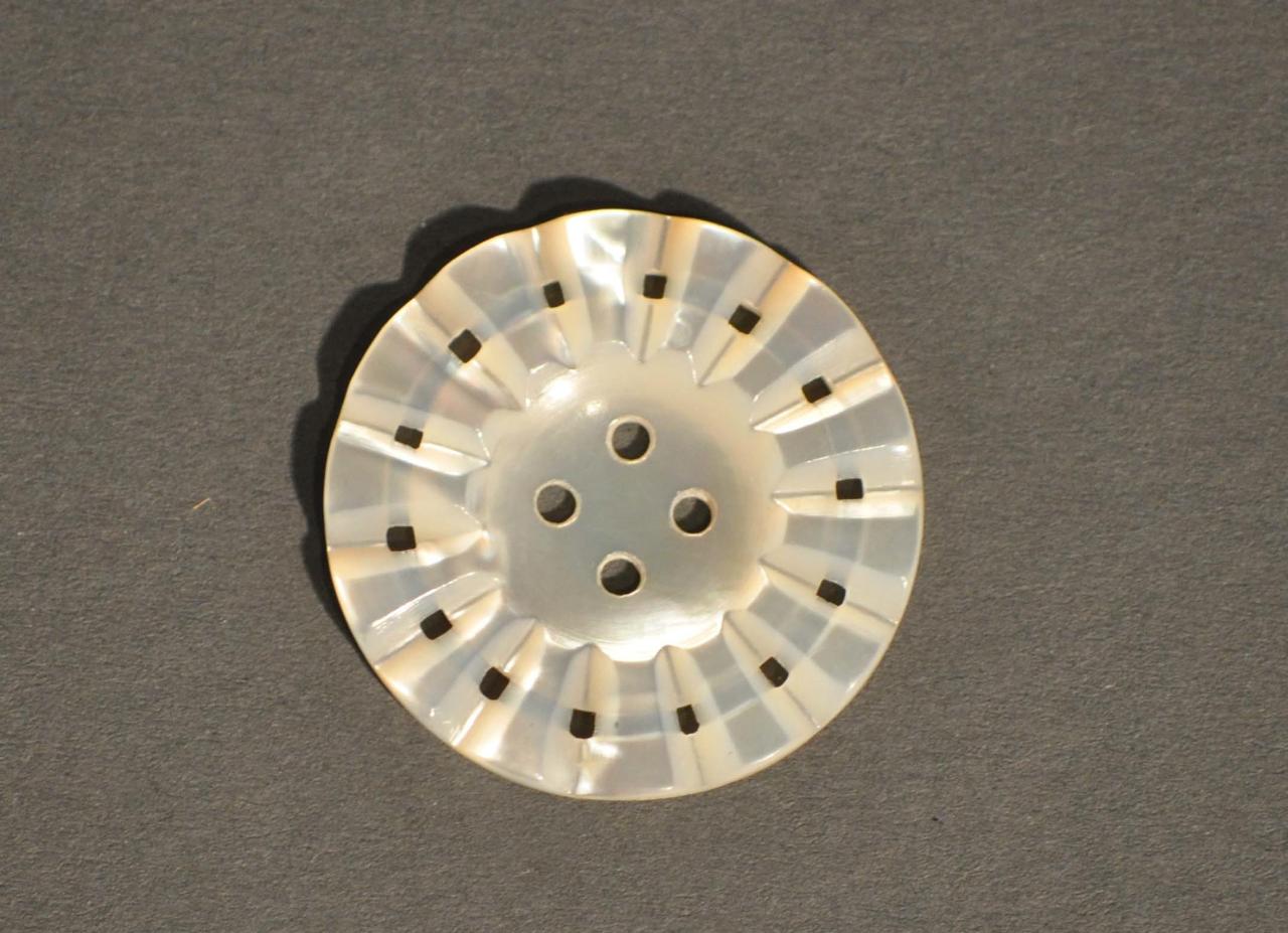 Bottone circolare in madreperla, fascia esterna incisa, sagomata a ventaglio e traforata; quattro fori.