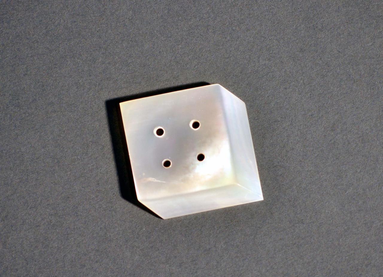 Bottone sagomato a cubo in madreperla; quattro fori.
