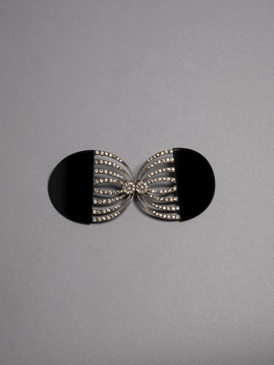 Fibbia a fermaglio da cintura, di forma composta. Corpo in metallo argentato, in due pezzi. Ciascuno circolare, leggermente convesso, decorato a traforo con motivo di fasce concentriche decorate con strass incolori e perlinatura; elementi centrali di raccordo circolari operati con pavé di strass incolori; applicazioni laterali in galalite nera. Passanti ad anello in metallo argentato.