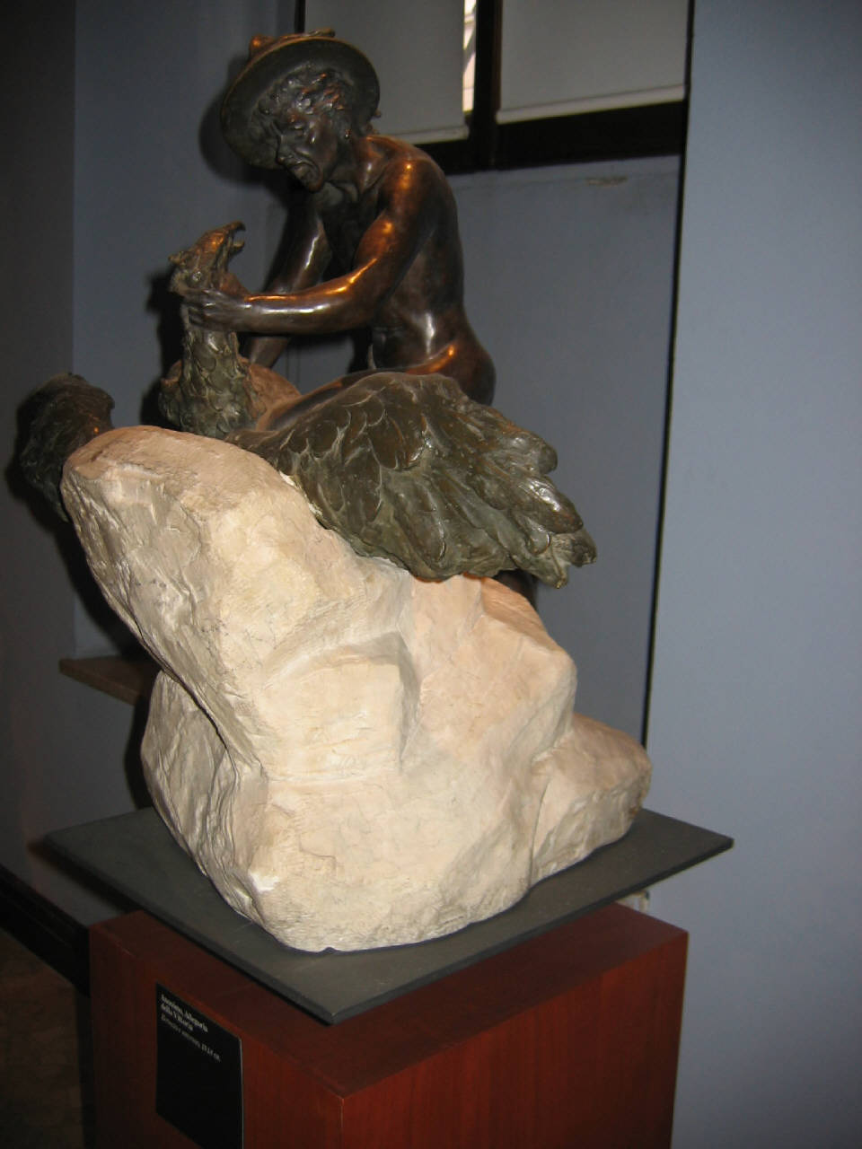 Monumento con base in marmo e sculture in bronzo. Figura maschile che afferrra per il collo un'aquila.