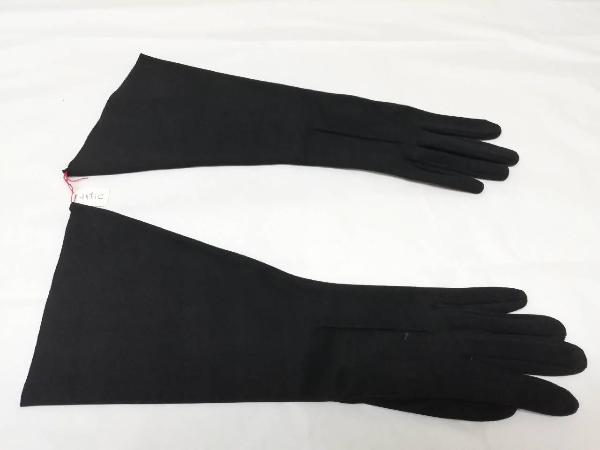 Guanti femminili in panno nero con polso svasato, lunghi 35 cm.