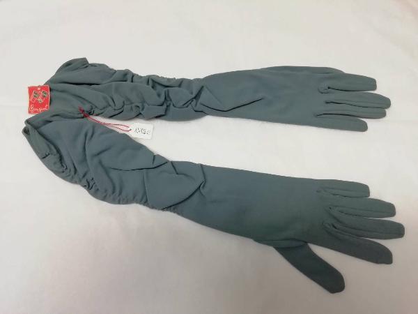 Guanti di tessuto a maglia di fibra artificiale color grigio freddo, lunghi 40 cm e trattenuti da un elastico che crea un effetto di drappeggio. Etichetta "Bonfanti".
